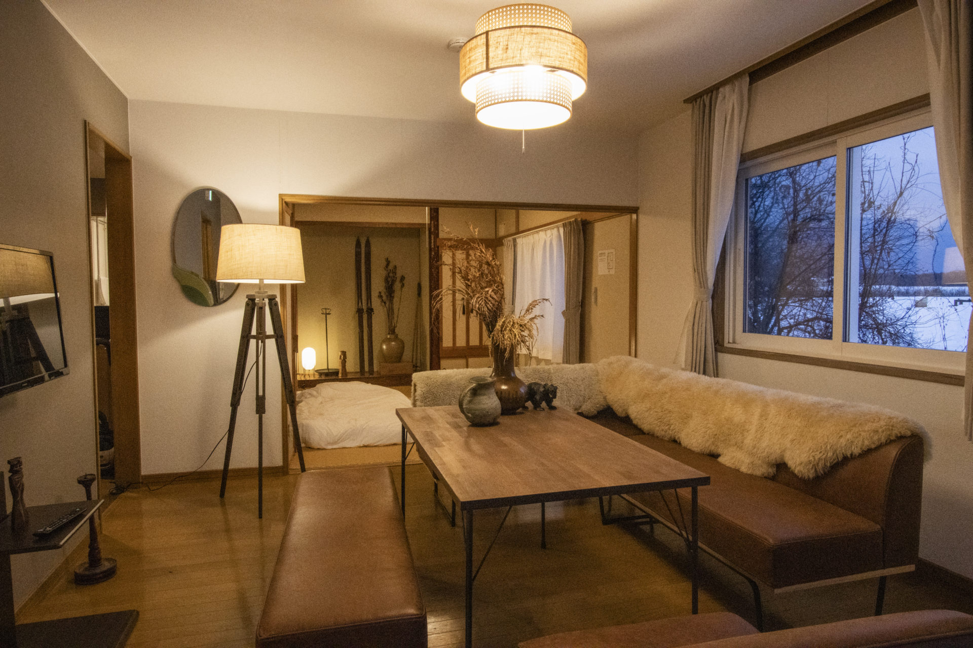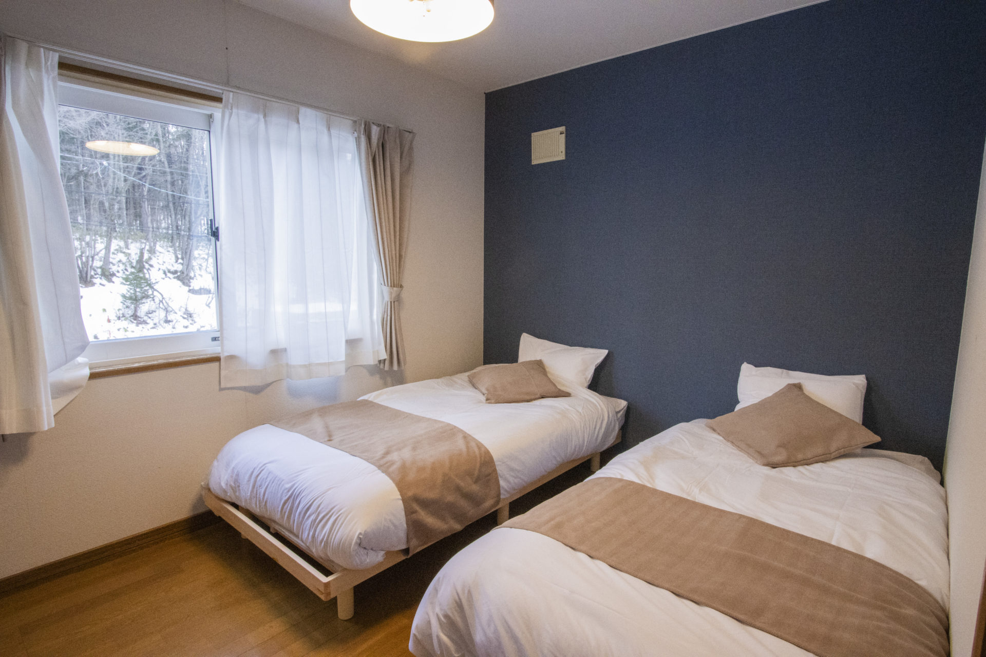 寝室は和室が2室、洋室1室で、お好みに合わせて布団やベッドで快適におやすみいただけます。最大7名様まで宿泊可能。玄関にはスキー板を立て掛けられるスペースもございます。