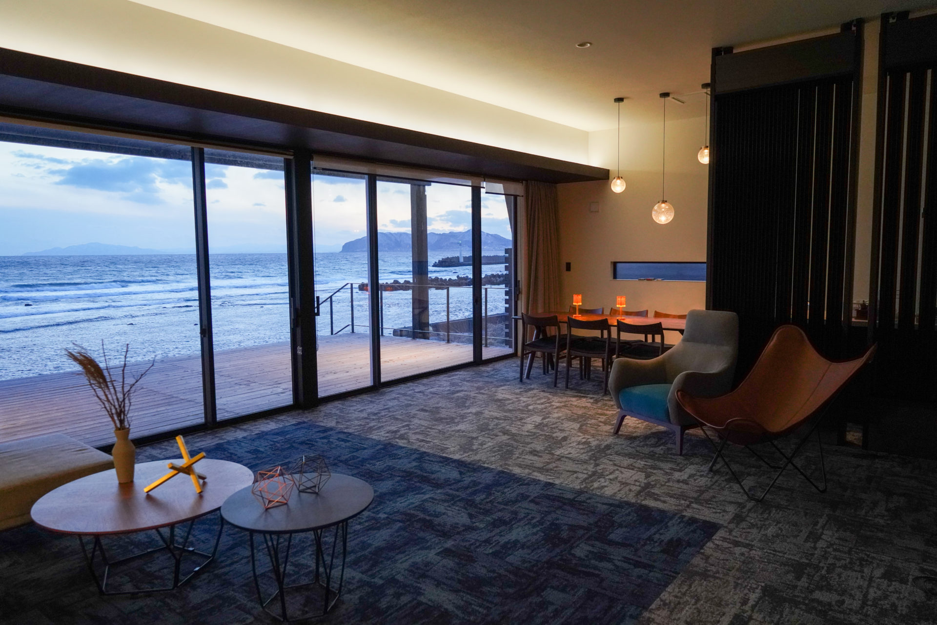 一面に広がる窓とウッドデッキから海を眺め、家族やグループでゆっくりお過ごしいただけるように空間をつくりました。