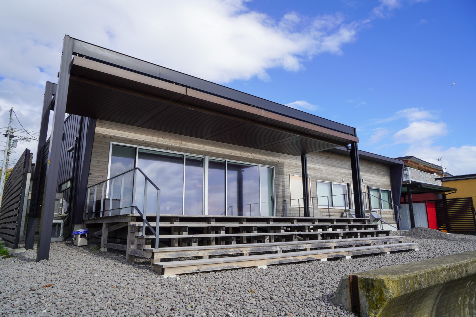 函館の志海苔町、海の目の前に位置する平屋の無人ホテル。