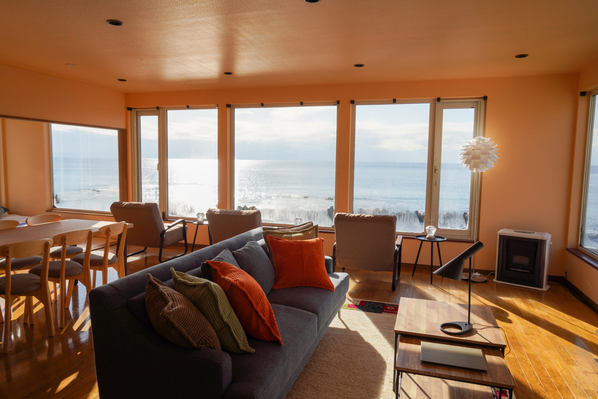 窓際にはオーシャンビューをひとり占めできる様なカフェスペースをセッティングしました。のんびりと珈琲やお酒を飲みながら、海の表情を味わうことができます。夜は波の音だけを聞いても楽しめますし、温泉へも気楽に出かけられるロケーションです。