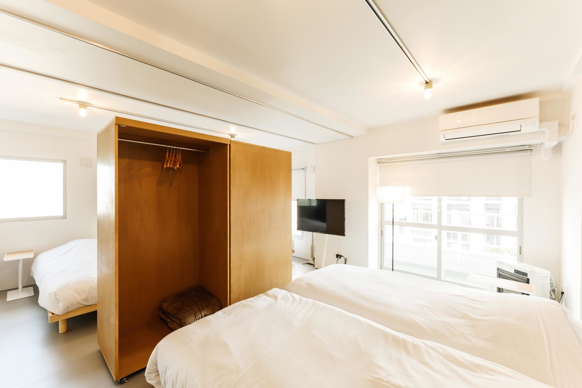 両部屋はフルリノベーションが施され、白を基調とした明るくスタイリッシュな空間です。もちろん、それぞれのお部屋にリビング、寝室、キッチン、家具家電も完備しており、大人数での旅行でもプライベート空間が保たれます。