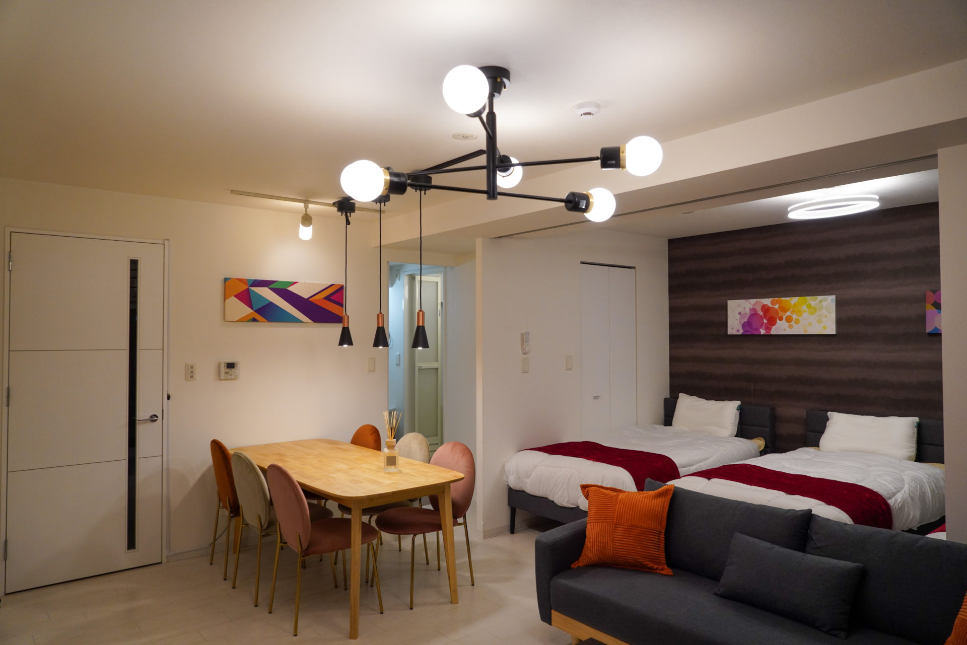 寝室は2部屋でシングルベッドが計5台、リビングルームにソファベッドが1台あり最大6名様まで宿泊可能。