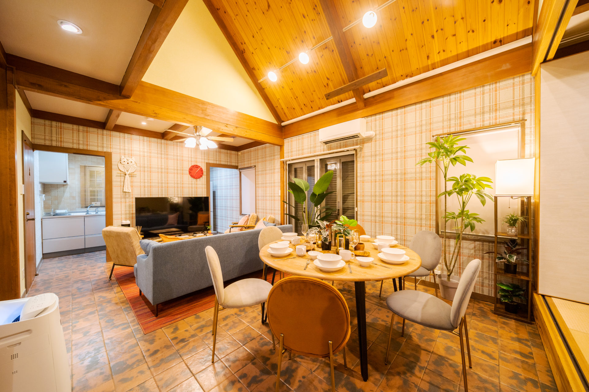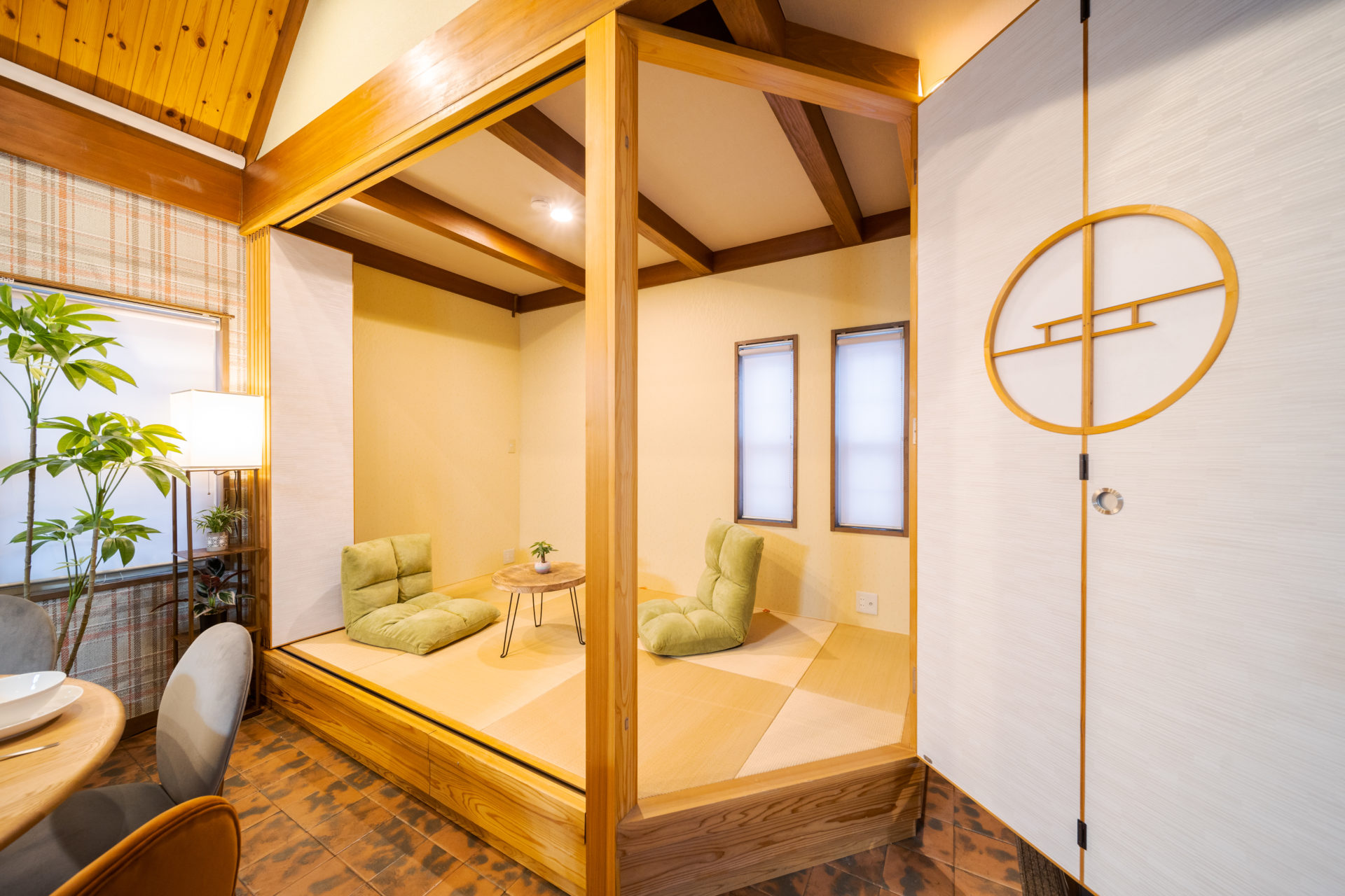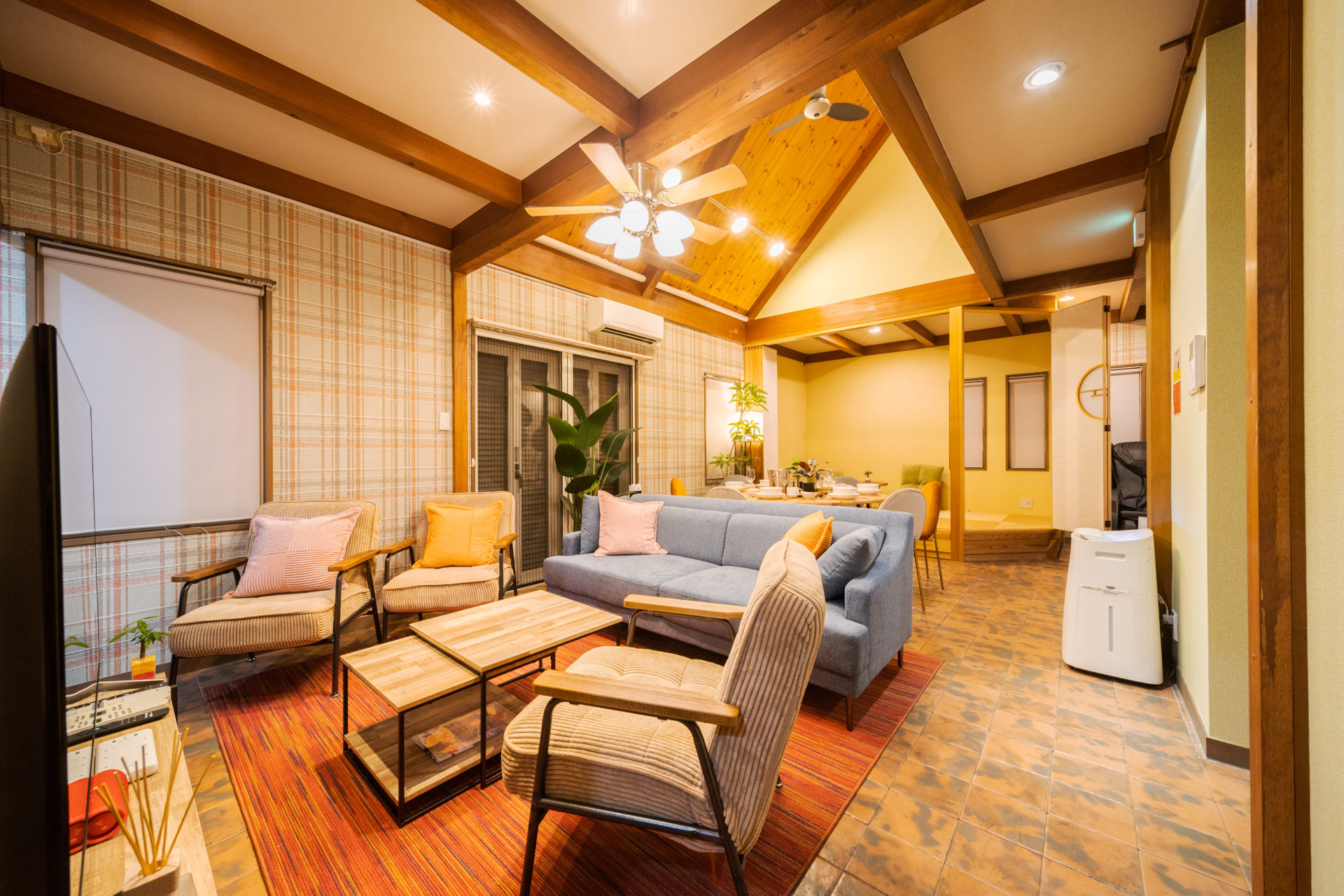 広々としたリビングには65インチの大型テレビやマッサージチェアを設置。リラックスできる和室スペースも魅力です。