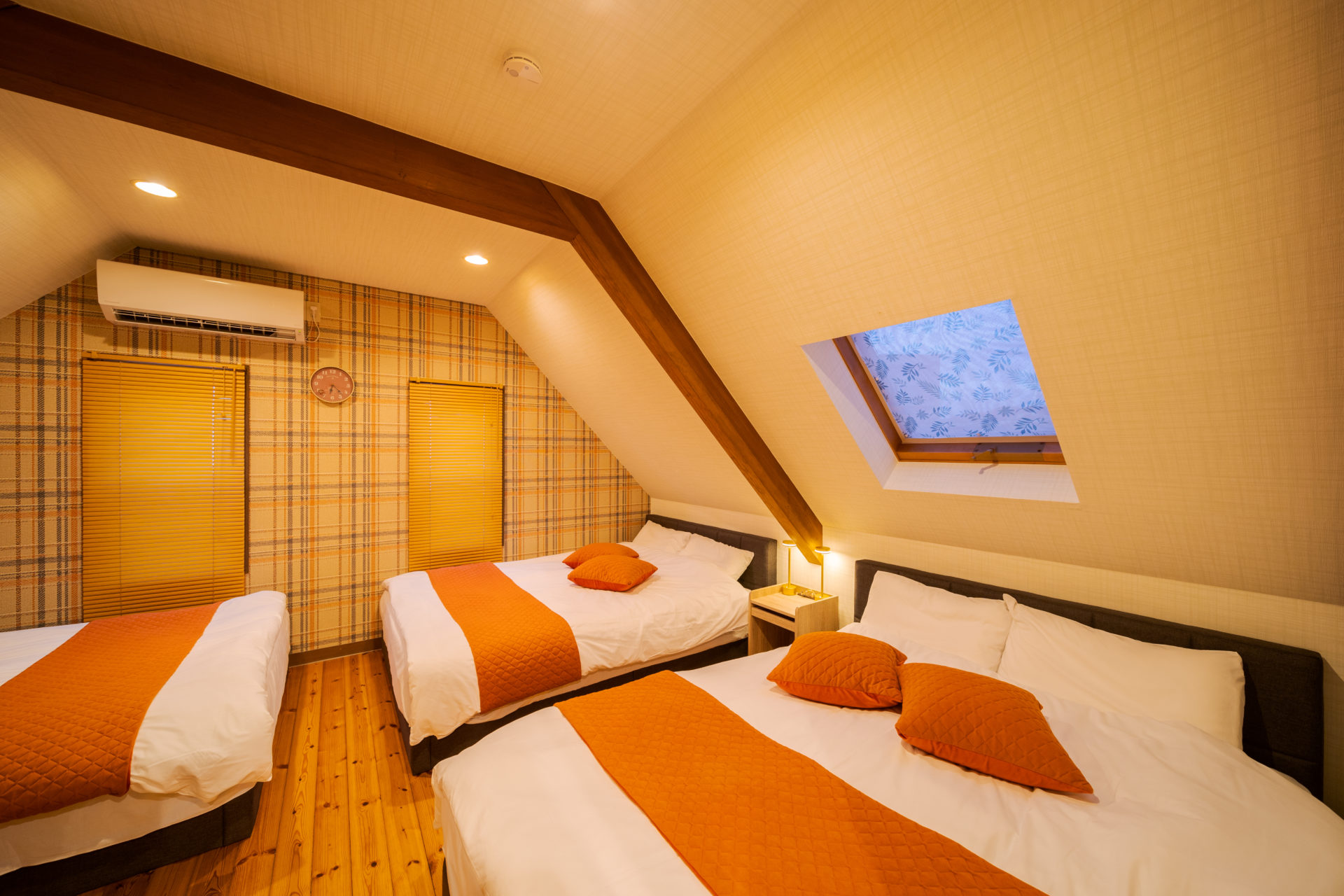 寝室は2部屋でダブルベッドを計5台設置。和室にはマットレスと布団1組をご用意しており、最大10名様まで宿泊可能。