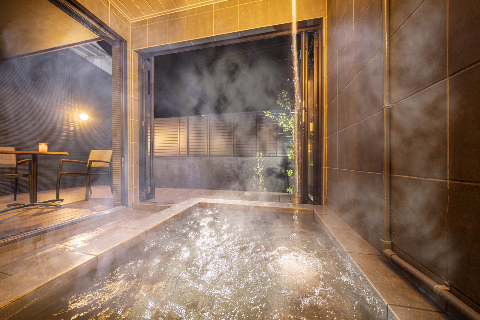 浴室は半露天風呂付き。高圧の打たせ湯も体験可能で、開放的な庭を望みながら源泉100%温泉をお楽しみいただけます。