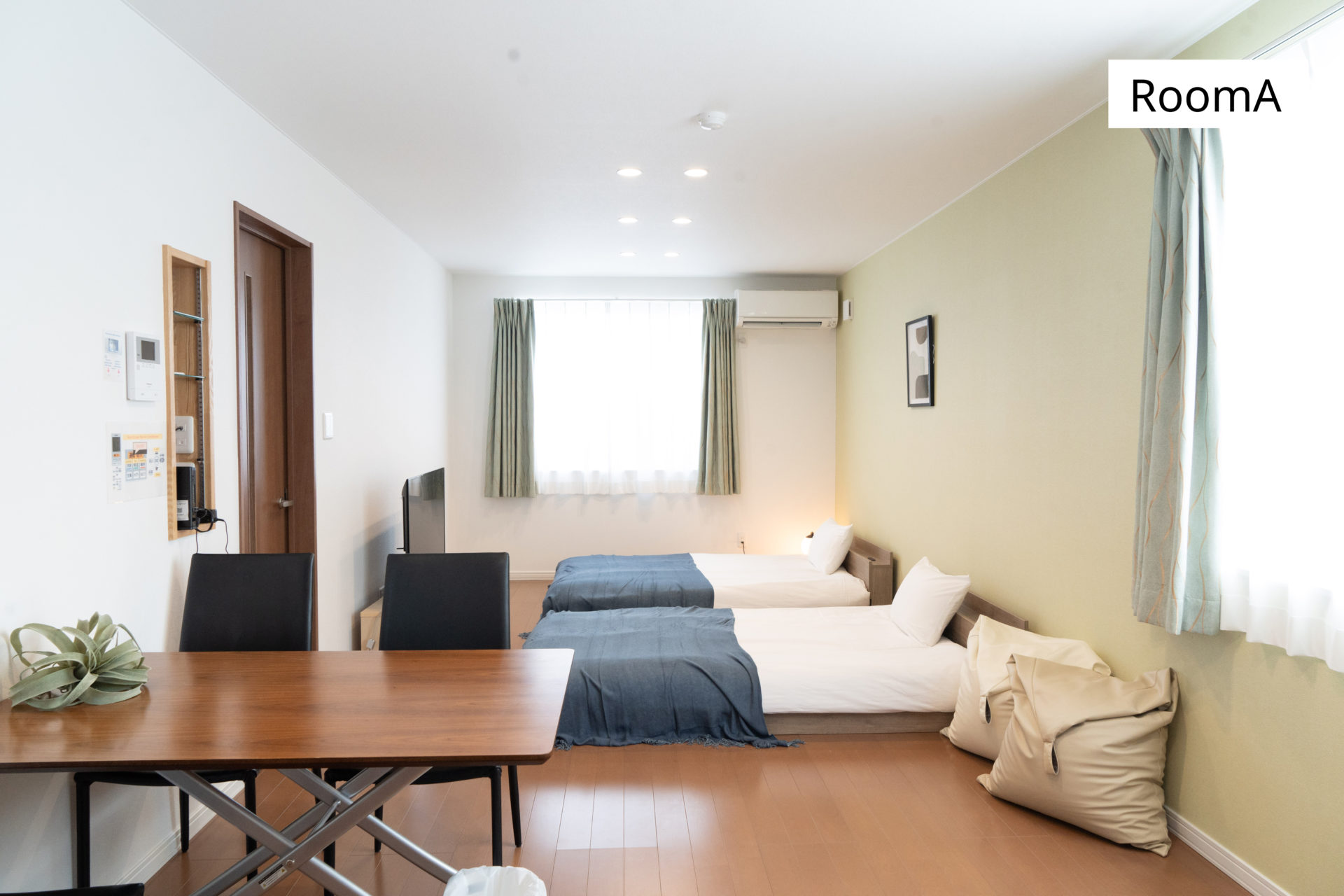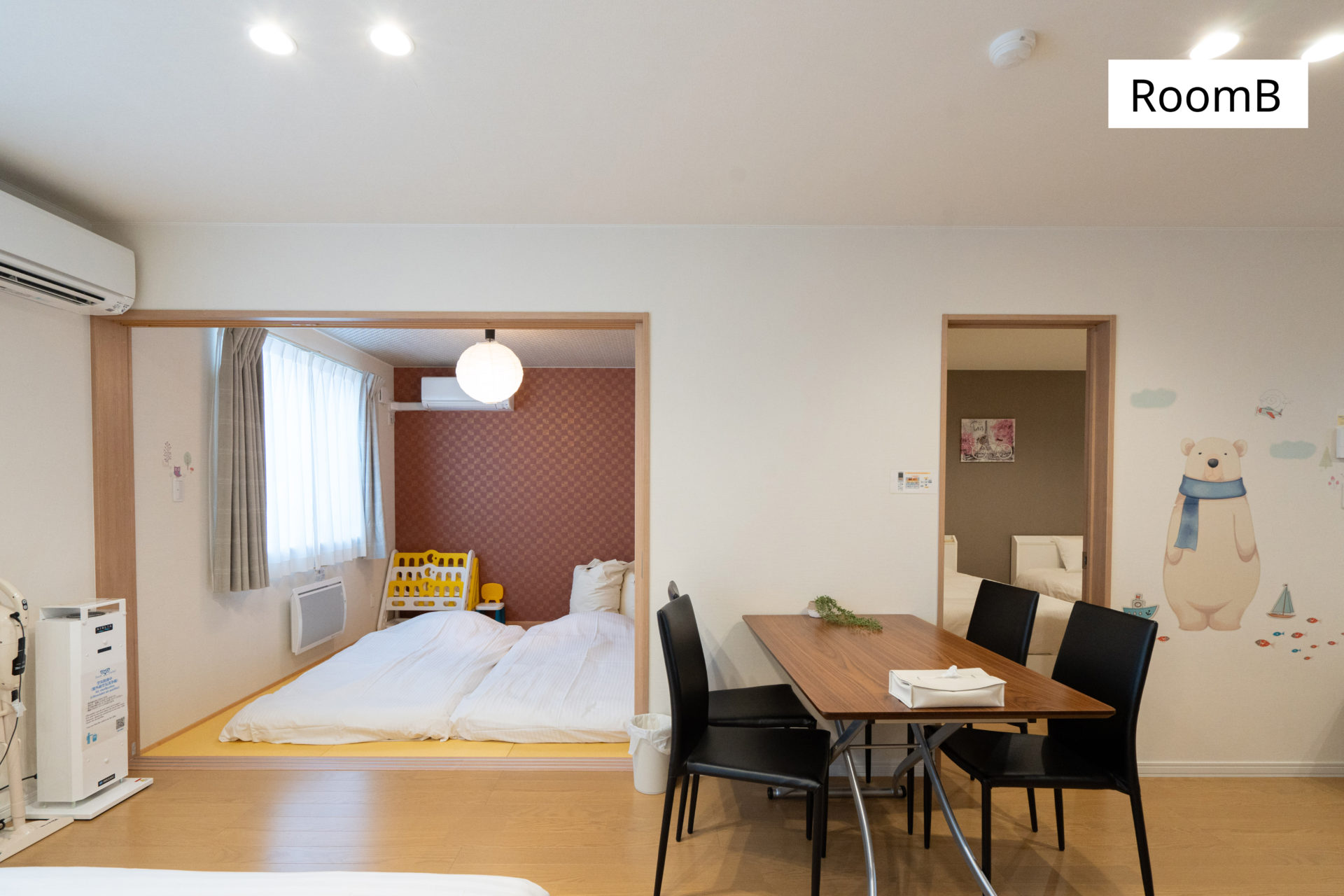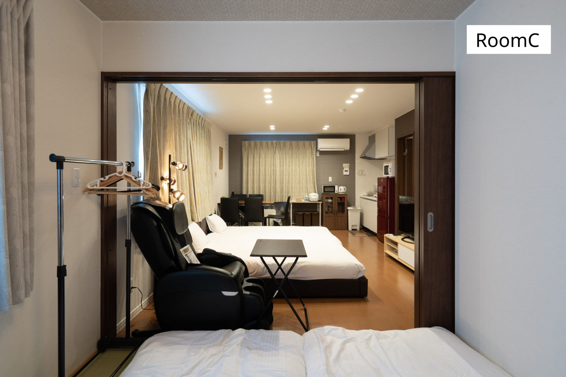 リビングにある寝室スペースの他、2部屋の寝室があり、ベッドや布団でお好みに合わせておやすみいただけます。