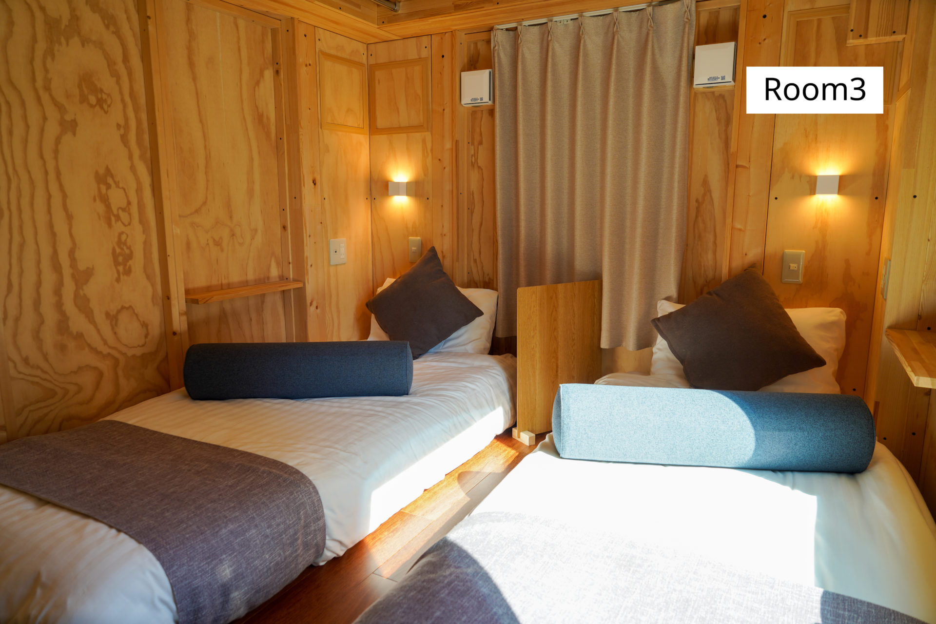 ムービングハウスは全部で3棟、1棟1室として予約を受付け、1室あたりの最大収容人数は6名となっております。